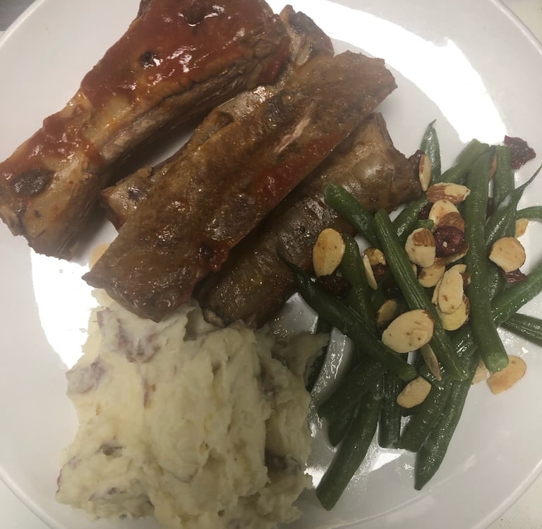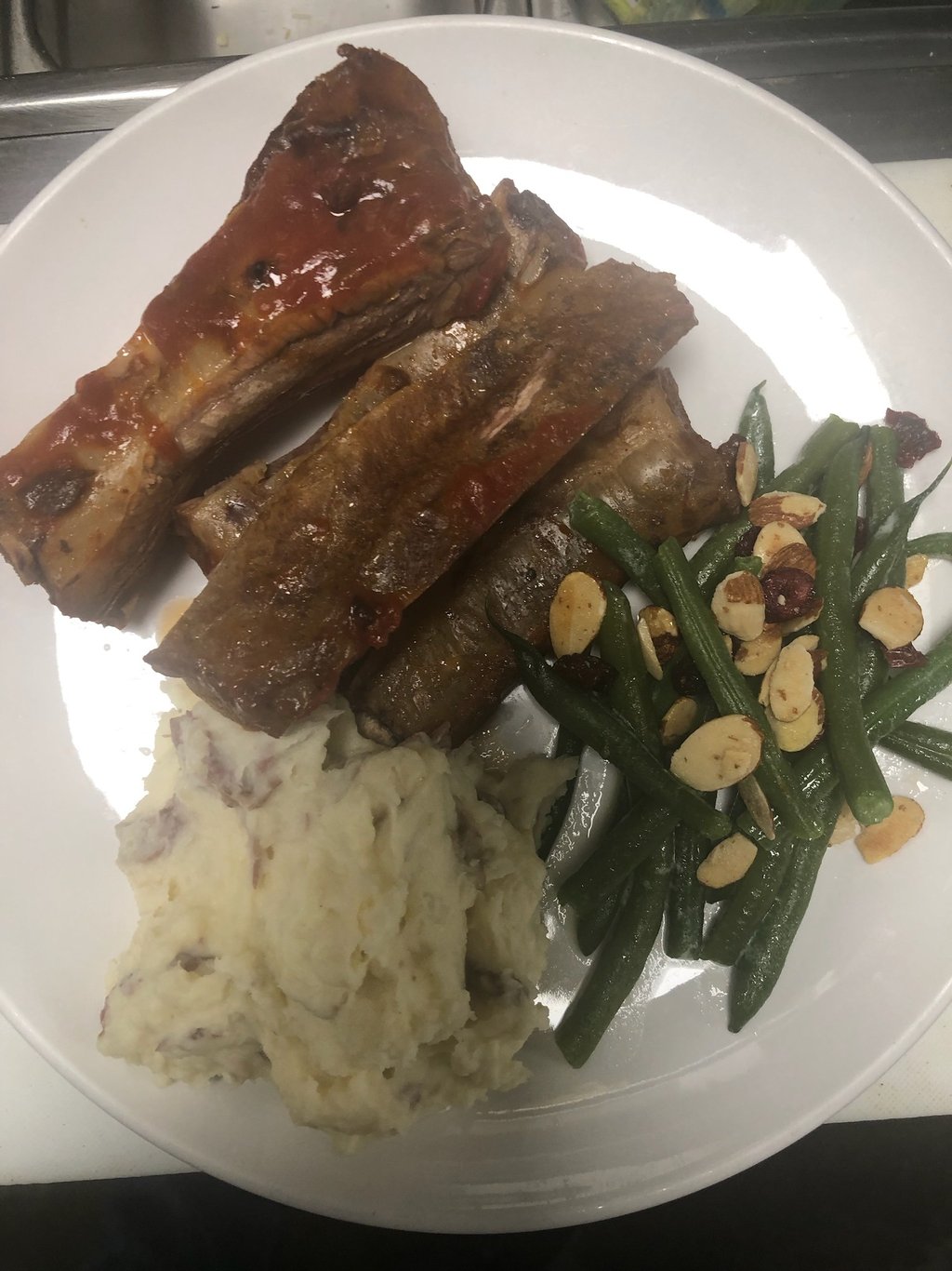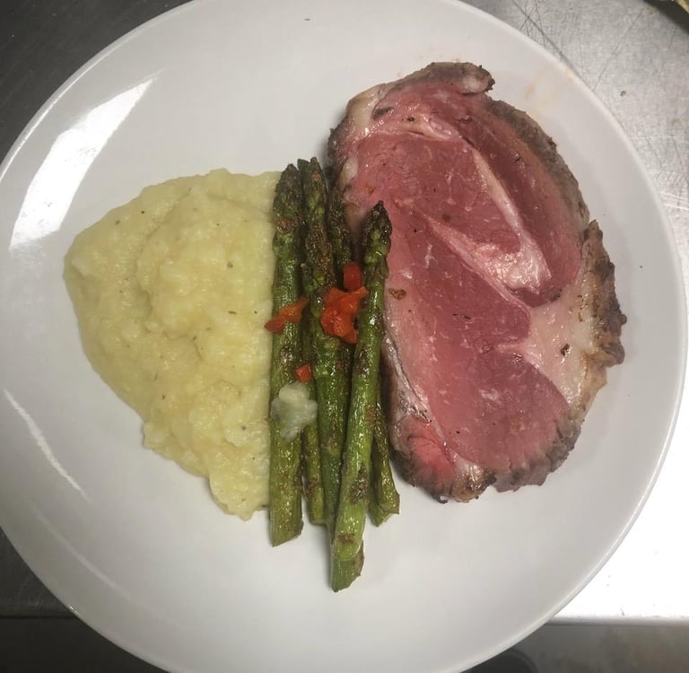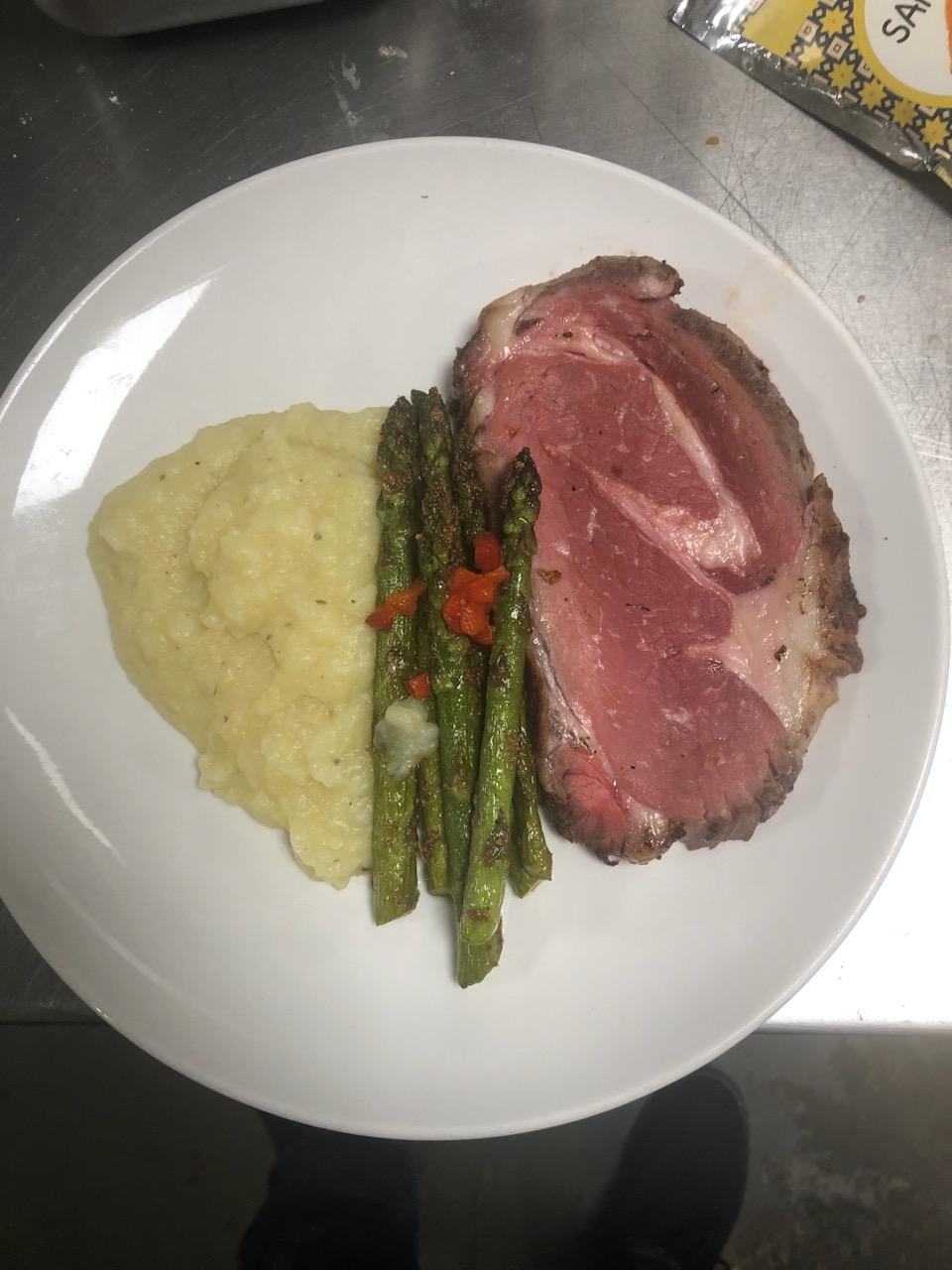Prime rib, garlic & basil mashed potatoes, sautéed asparagus