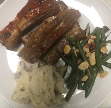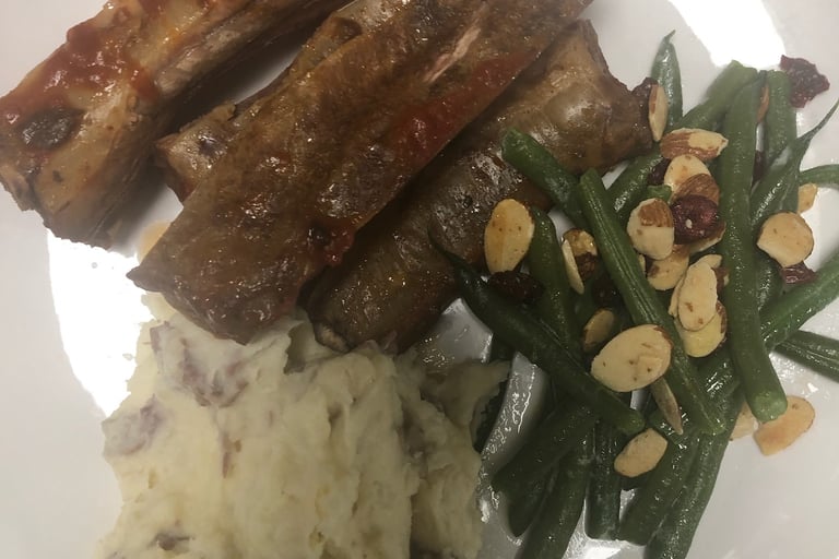 Ribs, mashed potatoes, and green beans